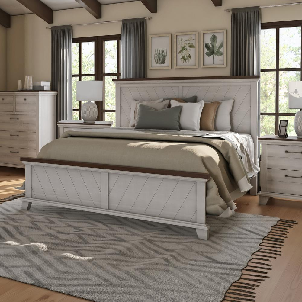 Bear Creek, a rustic, farmhouse-inspired bedroom collection, features an ivory finish that contrasts beautifully with honey-stained tops and cap rails. The Bear Creek Queen Bed features a chevron patterned headboard and footboard topped by a thick cap rail in a contrasting finish. Bed requires the use of both a box spring and mattress (not included). Your purchase includes one queen headboard, one queen footboard, queen side rails and four slats with support legs.