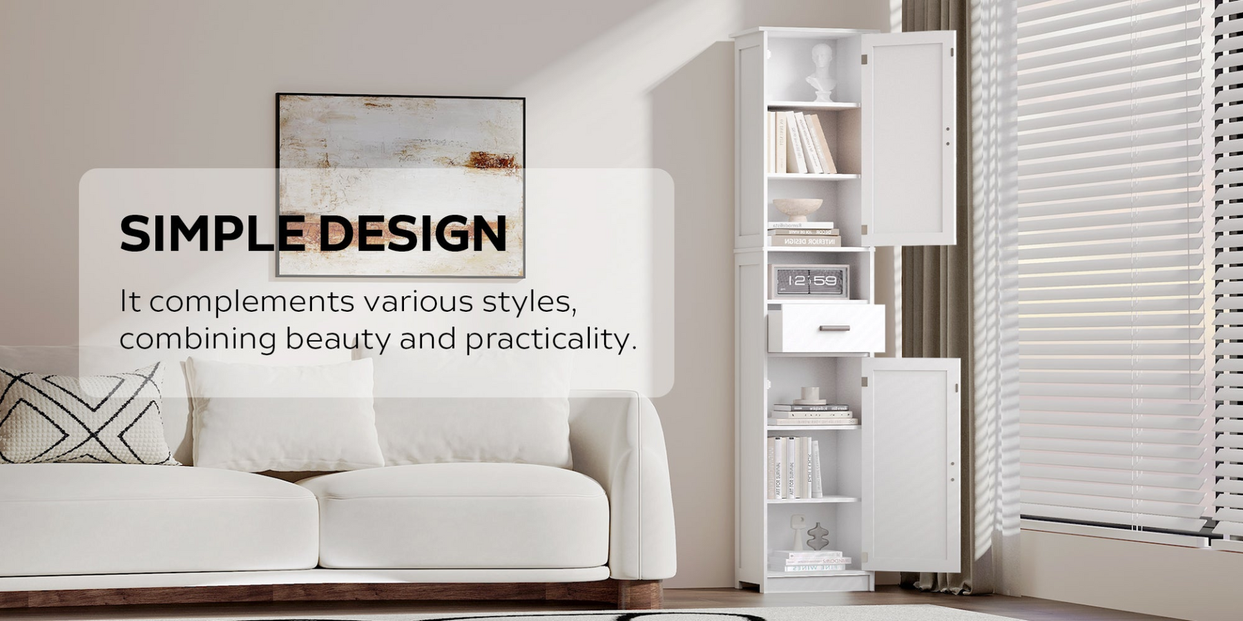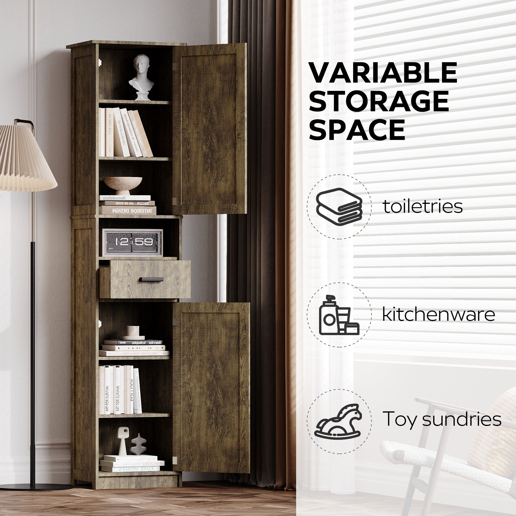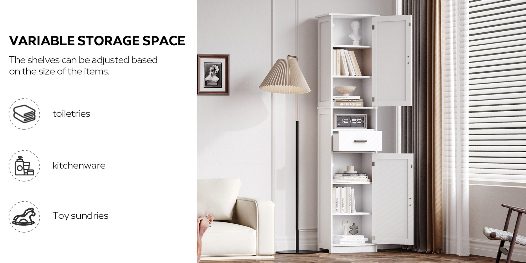 Adjustable shelving lets you customize the interior for toiletries, beauty products, towels, pantry items, books, or entryway essentials. Use it as a bathroom storage cabinet, kitchen sideboard, living room floor cabinet, or home office bookcase—its versatile layout works wherever you need extra storage without taking up much floor space.