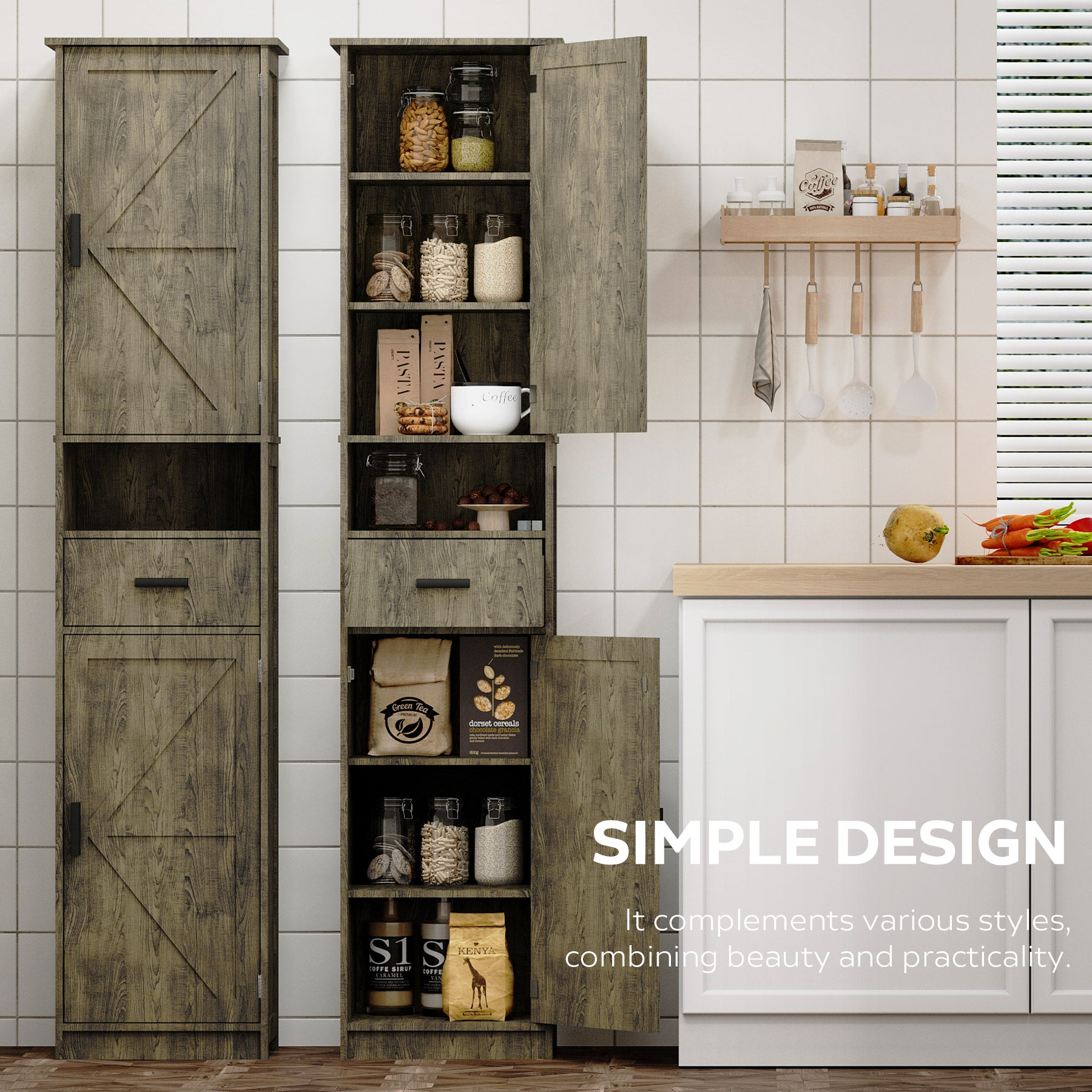 This tall, narrow floor storage cabinet brings big organization to small spaces with a smart vertical design that fits neatly into corners and tight gaps. Combining open and hidden storage, it features 2 barn-style doors, 1 smooth-glide drawer, and 7 total storage spaces to keep everyday essentials tidy and easy to reach.