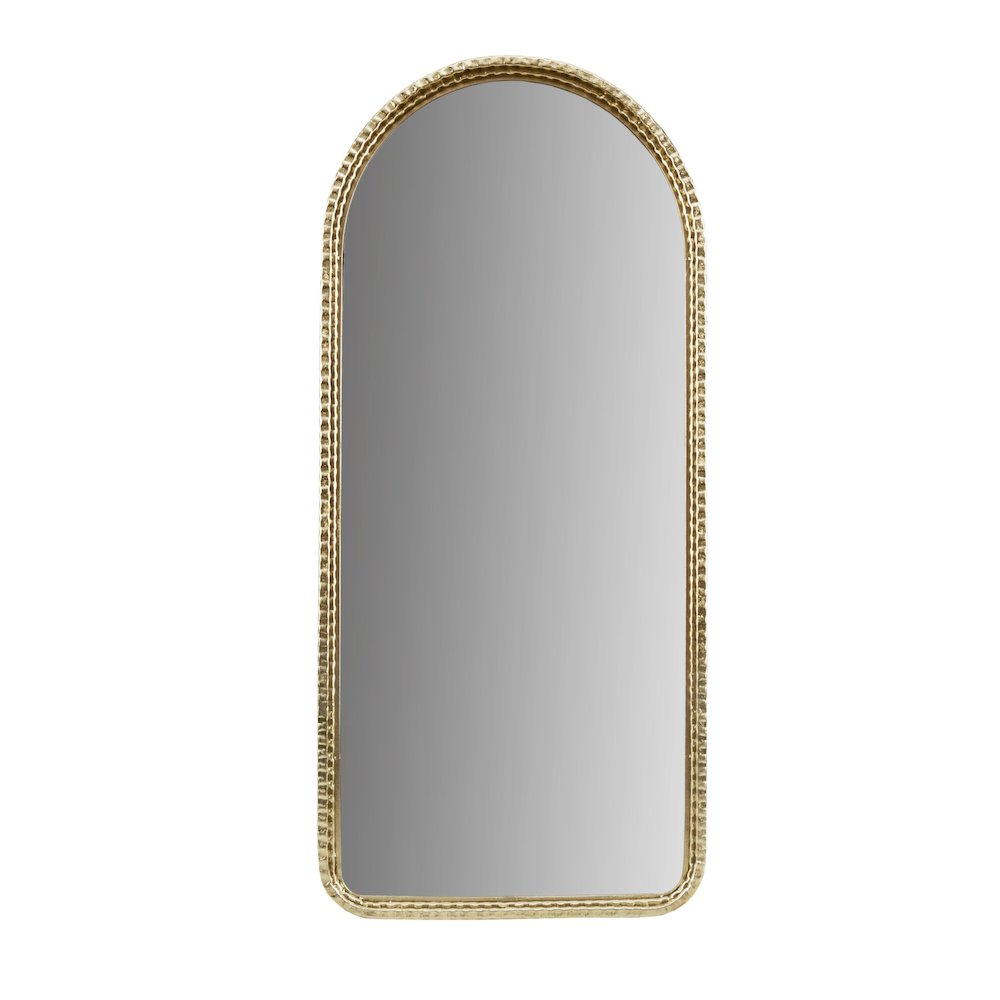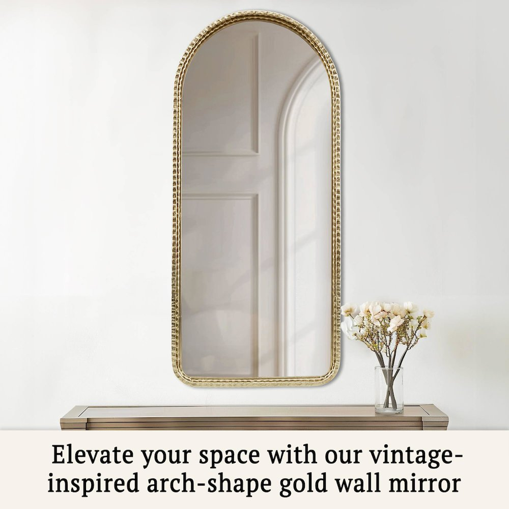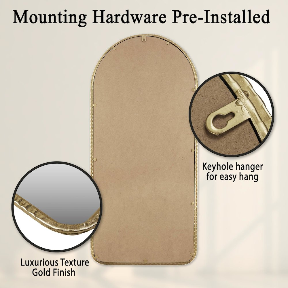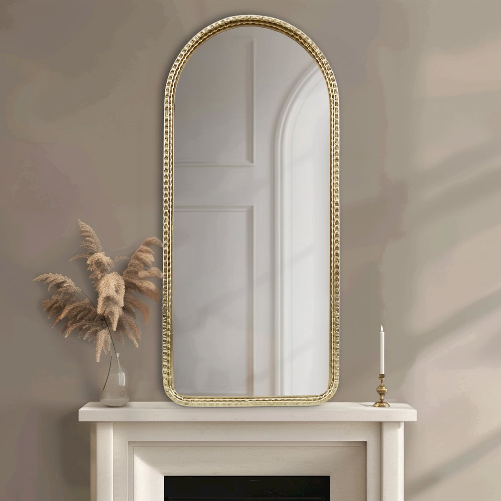 Elevate your space with opulent charm using our arched wall mirror in a dazzling gold finish. This epitome of glam and luxury is a ready-to-hang masterpiece, featuring a single keyhole hanger for your convenience. Its exquisite design will elevate your decor, while spot cleaning ensures it maintains its pristine allure. Perfect for enhancing indoor aesthetics, redefine your surroundings with sophistication and indulge in the perfect blend of beauty and functionality.