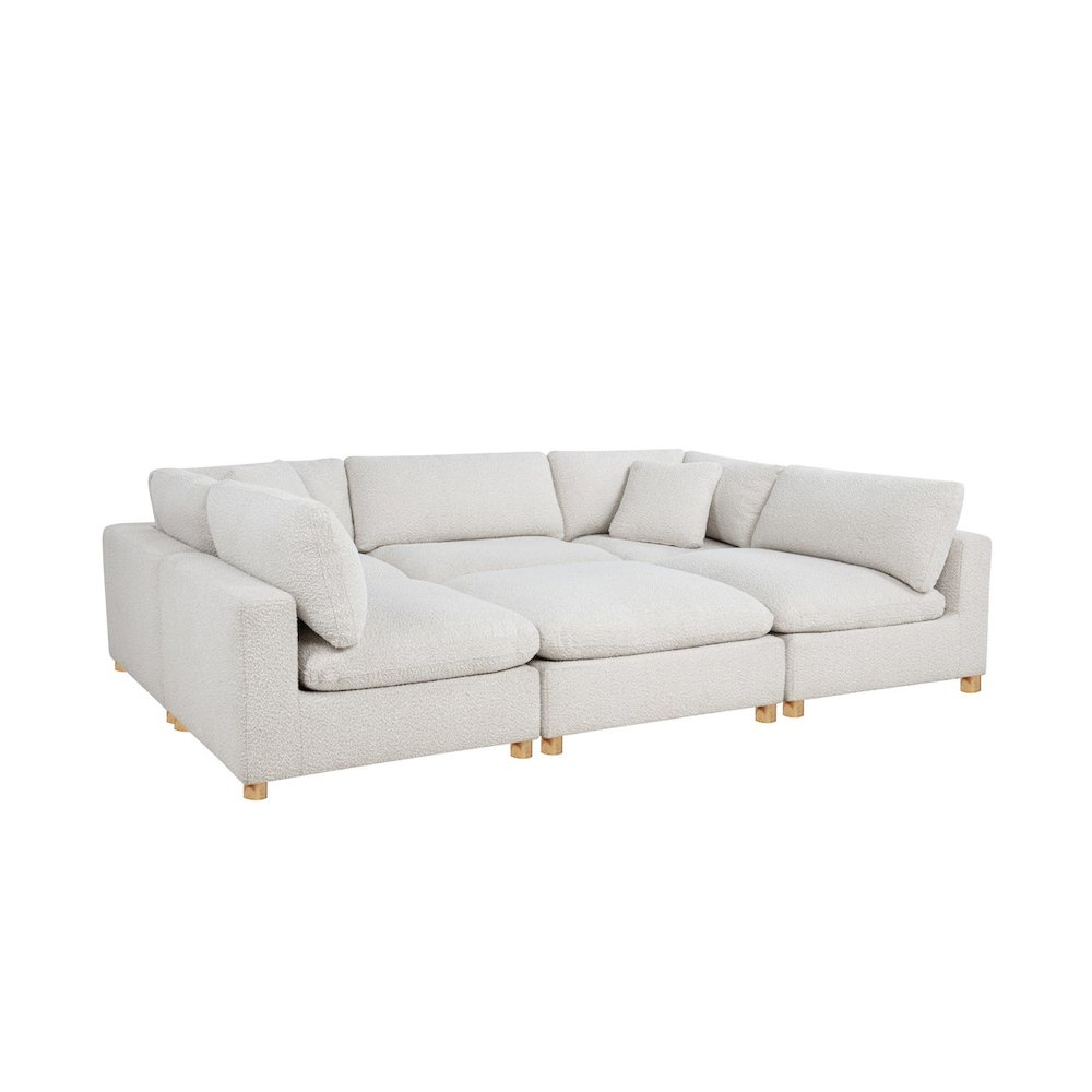 Elevate your living space with this beautifully tailored Mediterranean farmhouse sectional. Upholstered in textured bouclé fabric and supported by natural wood legs, this 6-piece design blends rustic warmth with modern comfort.