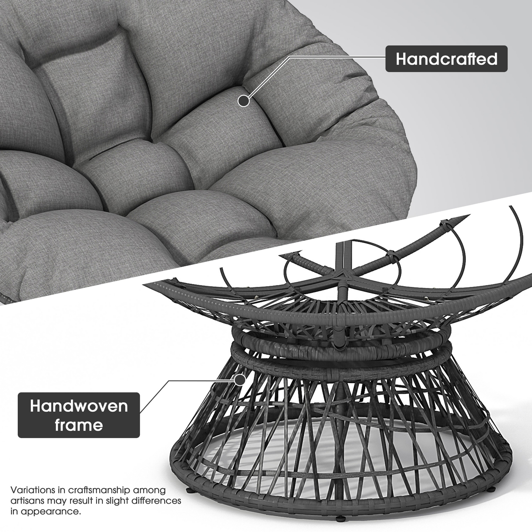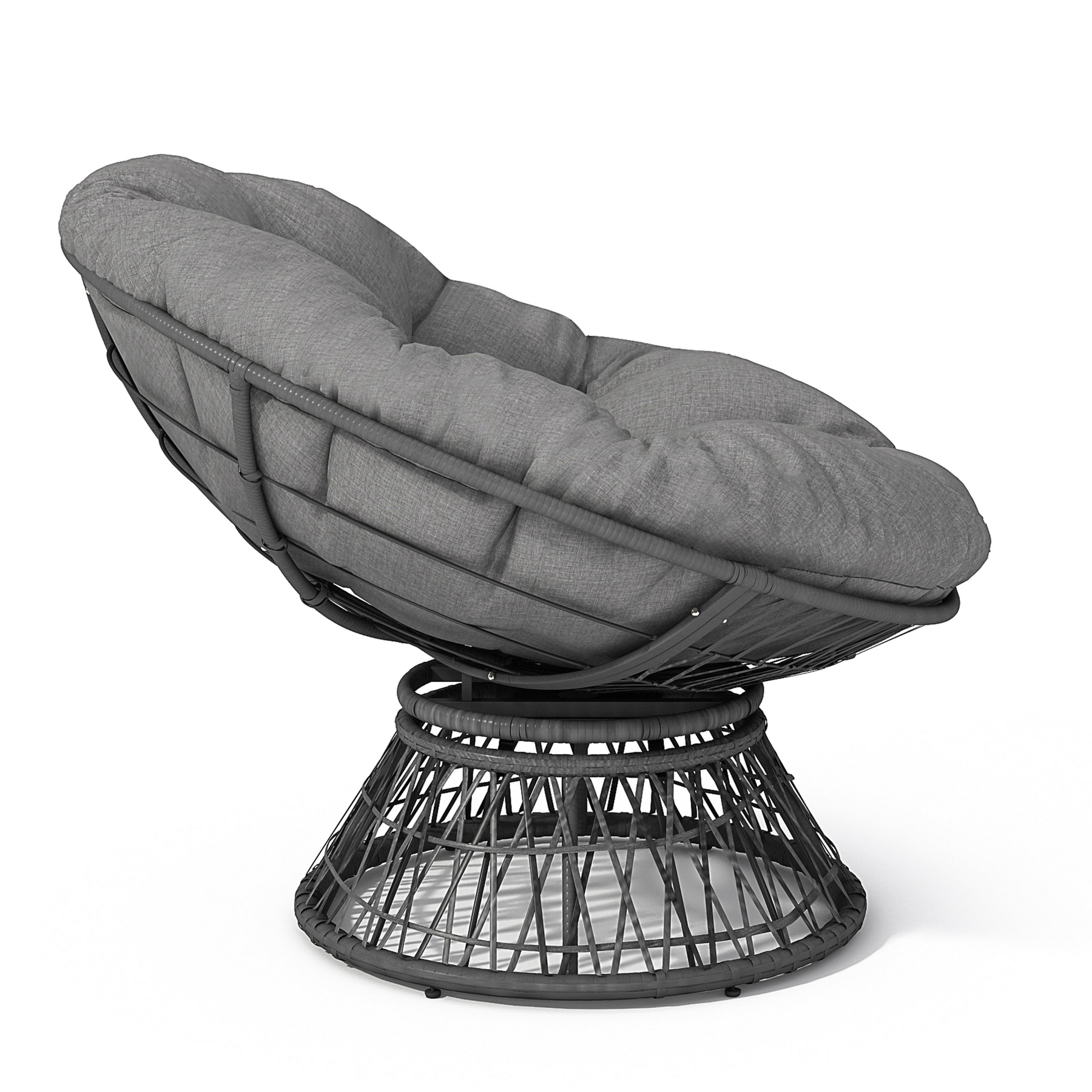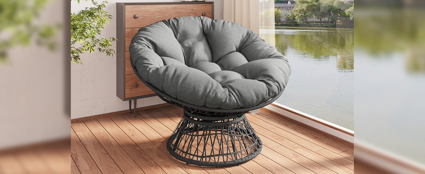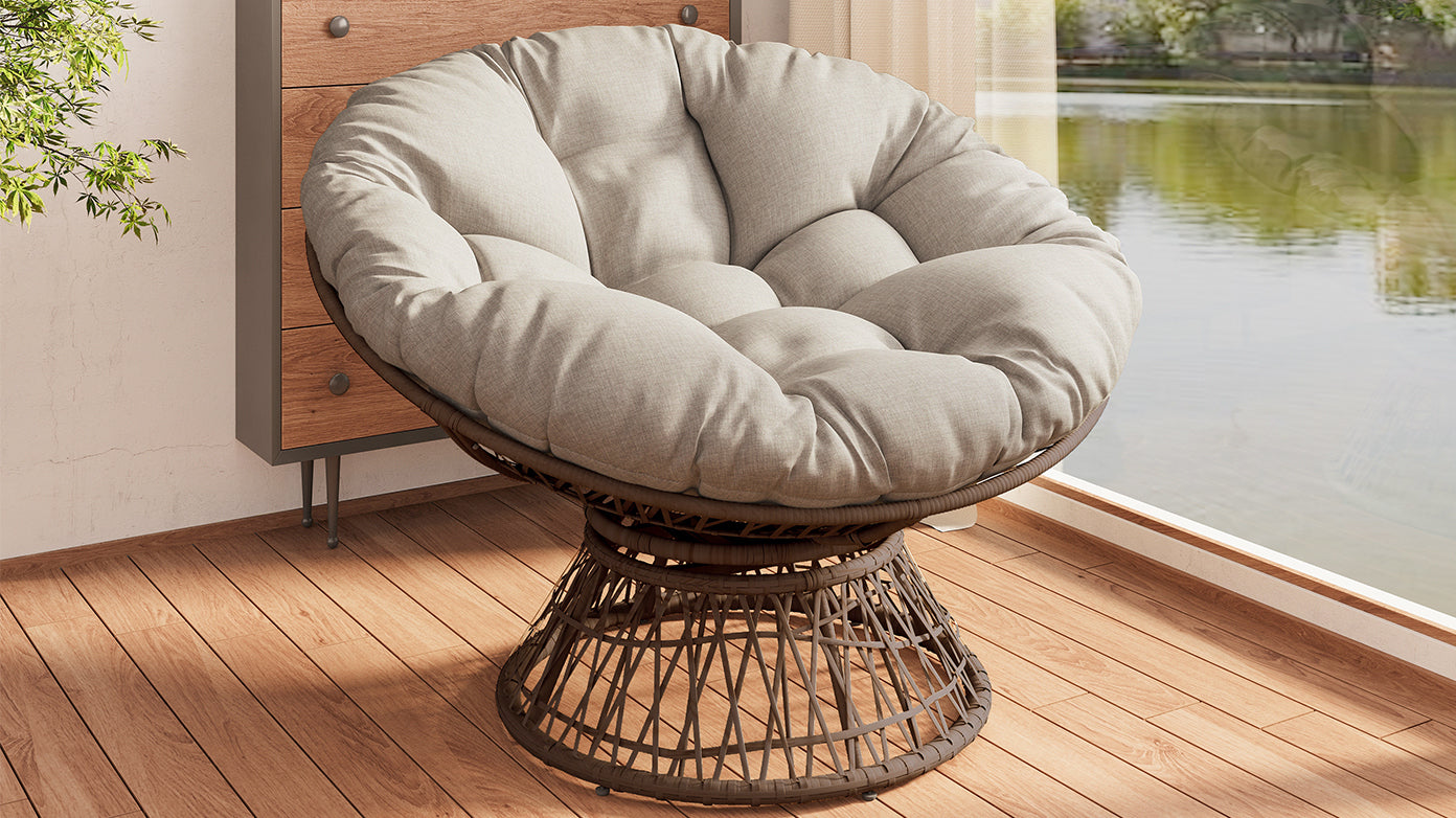 Bring elevated comfort and timeless style to your space with this ergonomic wicker papasan chair designed for everyday lounging, reading, and relaxing. The ultra-thick, high-density foam cushion delivers cloud-like support to help reduce pressure and encourage better posture during long sits. Upholstered in durable polyester with a 3-proof performance cover that’s waterproof, stain-resistant, and UV-resistant, it’s easy to maintain and built to hold up to daily life. A smooth 360-degree swivel makes it effortless to turn and engage with your room, while adjustable feet help keep the chair stable on uneven surfaces. The sturdy iron frame paired with woven faux rattan provides dependable strength and an inviting, natural look that complements living rooms, bedrooms, and lounge spaces. Ideal for residential use, this comfortable swivel accent chair includes a removable seat cushion and arrives ready for simple assembly with tools included.