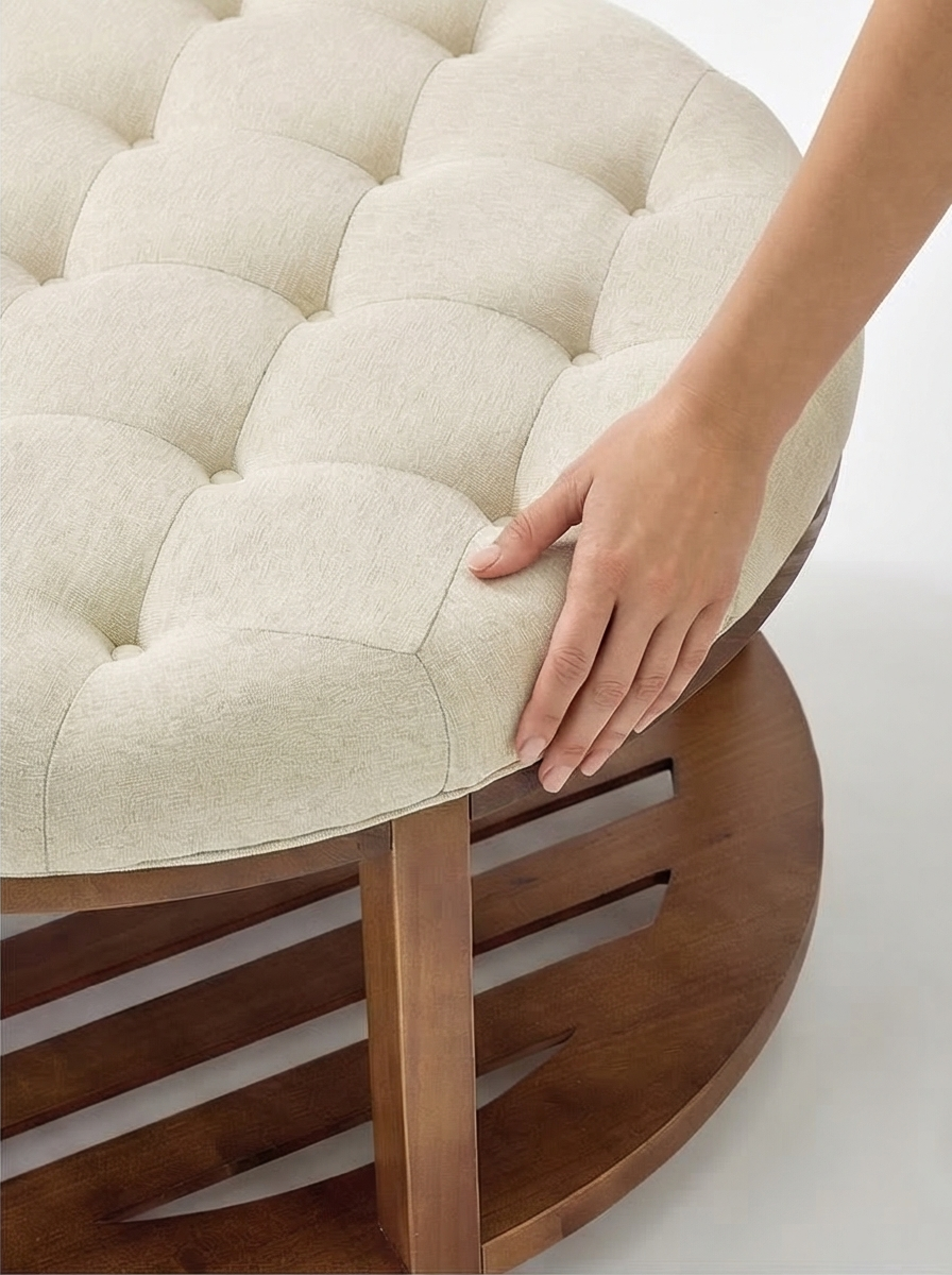 The Aurelia Round Coffee Table Ottoman combines the beauty of Mediterranean design with practical storage and everyday comfort. Its plush cushion, sturdy wood frame, and hidden storage make it the perfect centerpiece for a stylish and organized living room.
