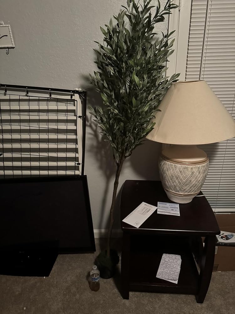 Wow, I'm so happy with my purchase! The artificial tree is beautiful, As you can see in the photos, its leaves are very natural. high-quality, and the olive trees look so real, believe me, you'll love it. You can put it anywhere in your house; it looks perfect in any spot. It's excellent quality and very easy to assemble. I truly recommend it 100%!