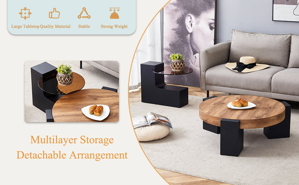 • Double-Layer Round Design: This coffee table features a double-layer round design with a transparent tinted glass top and a bottom layer of wood textured MDF board, providing additional usage space.