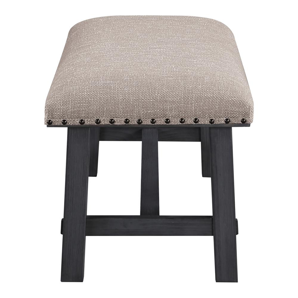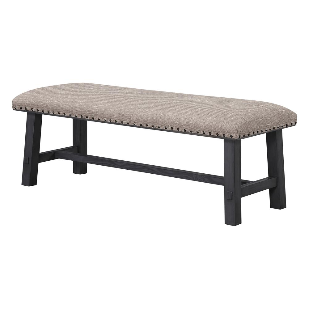 Beautiful transitional style bench Ideal in an entry or at a dining table Antiqued bronze nailhead trim Durable 80% Polyester 20% cotton fabric Soft, padded upholstery over kiln dried wood construction Attractive mortise & tenon joint frame adds dramatic detail Easy Assembly