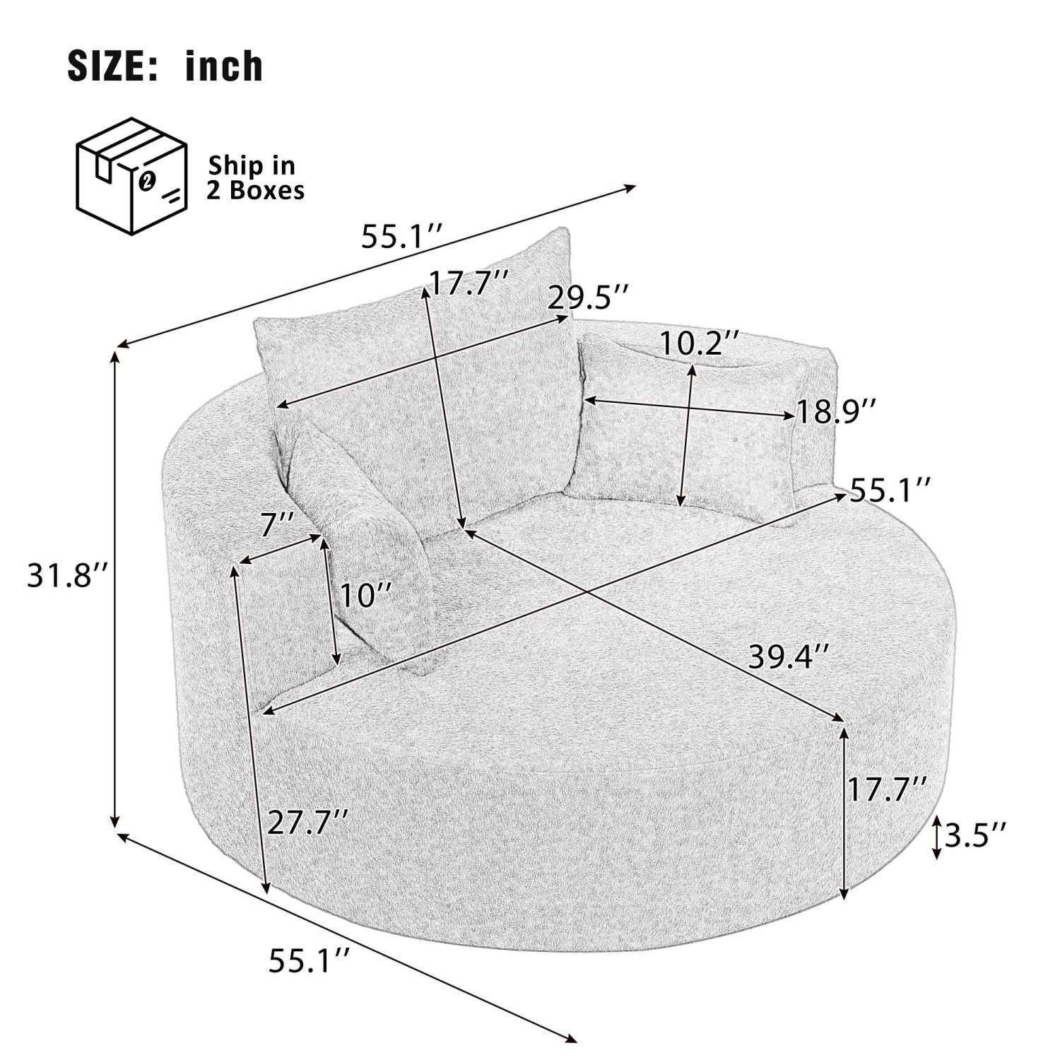This chair offers a perfect combination of comfort and style. With a 360-degree swivel base, it provides easy movement in any direction. The spacious 39.4-inch seat depth ensures comfortable lounging, while the luxurious chenille fabric is soft yet durable. The removable throw pillows make for easy maintenance, and the chair's modern circular design adds a sophisticated touch to any space. Despite its ample size, the chair is space-efficient, making it ideal for smaller rooms or apartments. Its versatility and sleek design make it a great addition to any living room, bedroom, or office.