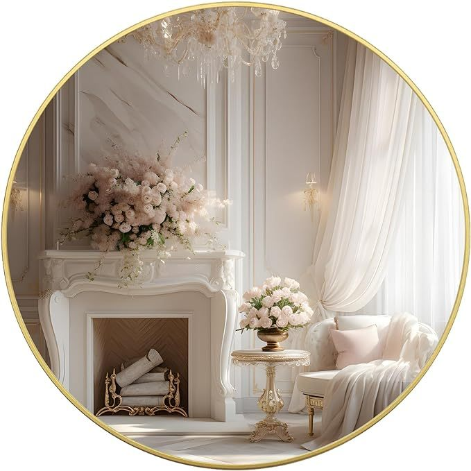 39 Inch Round Metal Framed Bathroom Mirror - Modern Wall Vanity Decor, 4mm HD Glass, Anti-Rust Aluminum Frame - Mediterranean Italian Contemporary Home Decor Furniture