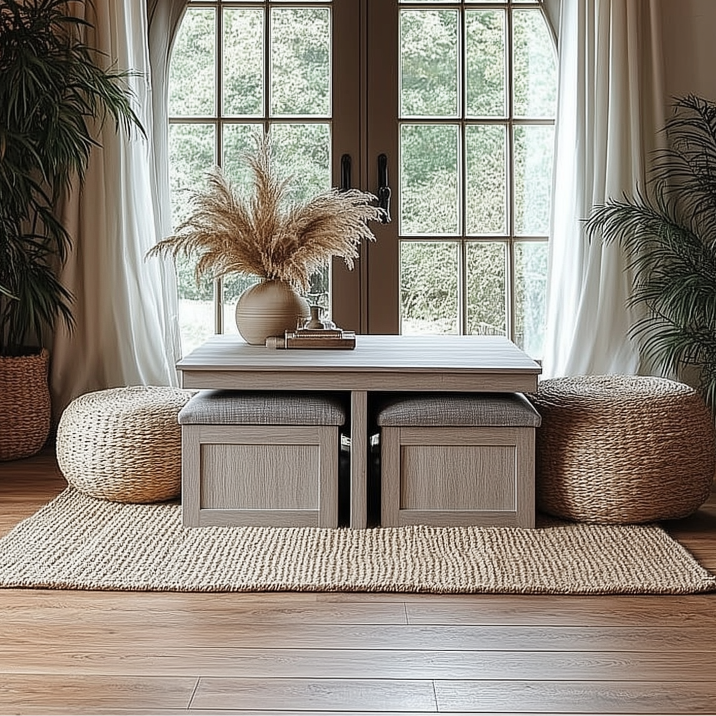 Four upholstered stools tuck under the table to save space and roll out on wheels when you need extra seating. Each stool includes a concealed compartment for blankets, remotes, or everyday essentials, keeping surfaces clutter-free.