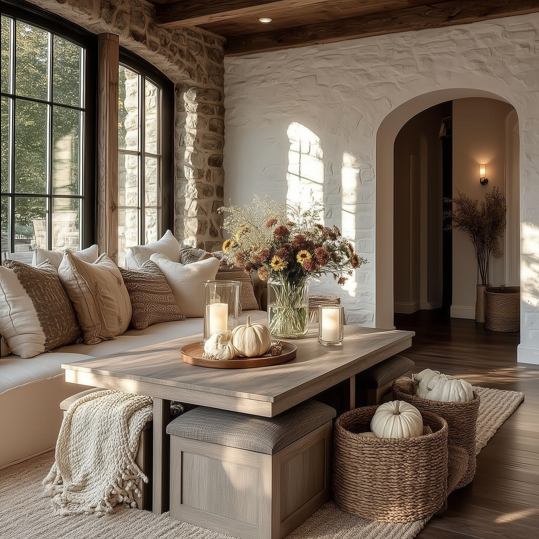 Mediterranean farmhouse style with hidden storage stools — elegant, practical entertaining solution.