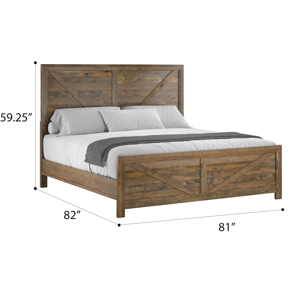 King-sized bed crafted from reclaimed pine with a caramel brown finish Rustic design with inset panels and detailed framing for added character Picture frame styling enhances the natural texture and warmth of the wood